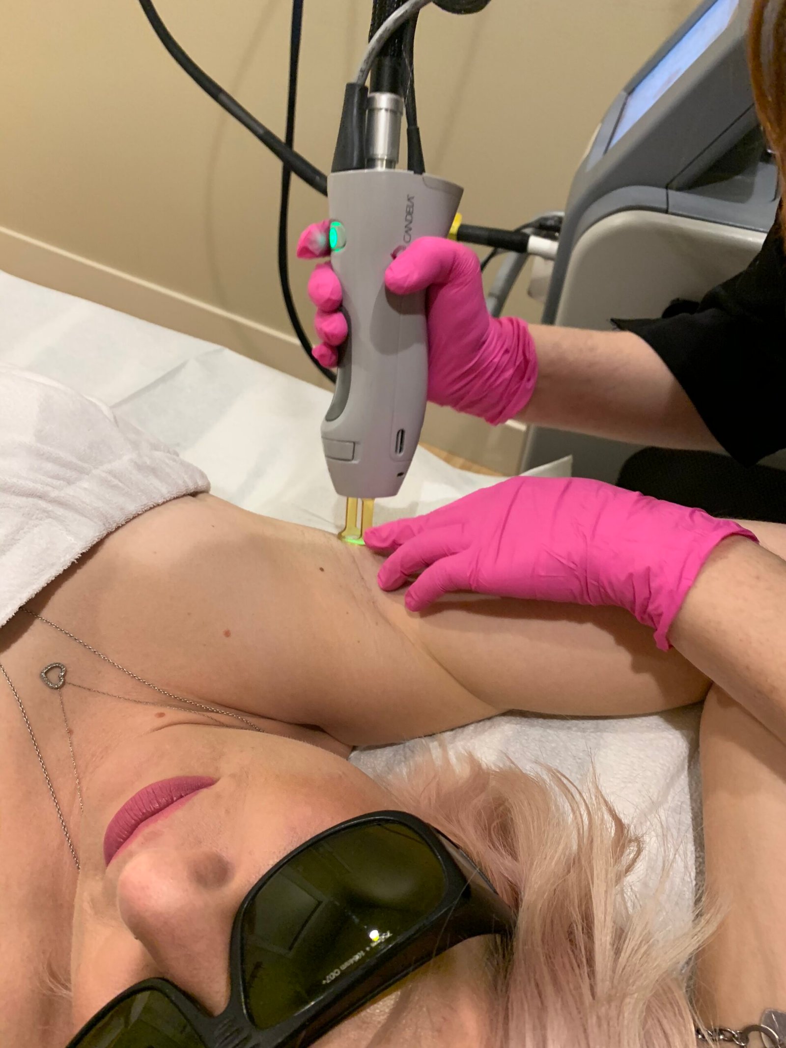 We use the GentleMax ProⓇ Laser which is a straight laser machine. There are two types of laser hair removal techniques— Intense Pulsed Light (IPL) and Straight Laser systems. IPL treatments weaken the hair follicle but do not permanently destroy it. More sessions will be needed for a lasting result when using IPL and, any change in hormones can cause hair to regrow. With the GentleMax PRO straight laser, the growth center within the follicle is completely destroyed for lasting results in minimal sessions.
